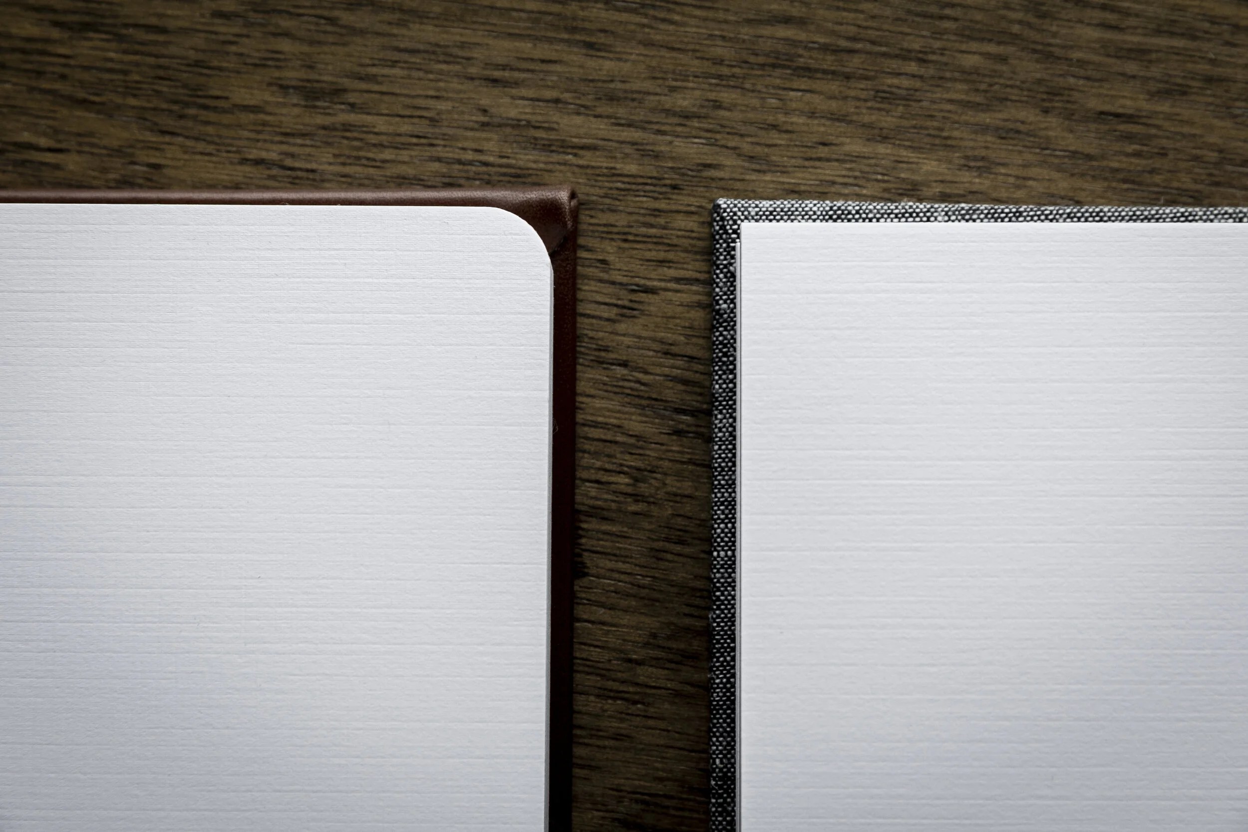 My most commonly requested album is an 8x12” landscape album with a leather or a linen cover. The pages and binding are done in the “layflat” style, meaning the pages open seamlessly from the center binding. This smooth style allows for a number of beautiful design options, some of which are available in the sample images here. Clients may elect to design an 12x12” square album, which is a great option for something bolder, recognizing that your professional images will be in a rectangular format by default, and cropping will occur for most images. Smaller albums sizes, such as the 6x9” album pictured here, are available for family members as gifts, or simply if you prefer a more diminutive style for your own. You may also consider making a “companion album,” which is an identical album to your own.